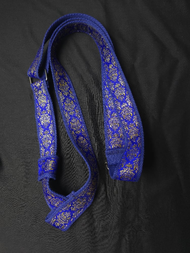 Elevate your shastar with this beautifully crafted royal blue damask-pattern gatra. Designed with intricate gold detailing woven into a rich blue base, this gatra combines traditional elegance with durable everyday practicality. The fabric is strong yet comfortable, offering reliable support for your kirpan while adding a touch of refined style.